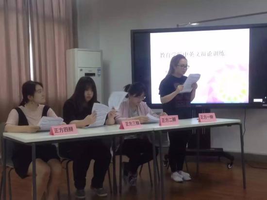 总之,在每个小组的训练中,双方辩手都能自信地陈述自己的观点,并在自由辩论环节展现敏捷的思维和犀利的语言。在每组辩论训练接近尾声时,正反双方都能对本小组的训练做出恰当的总结陈词使得本组训练完美收官。最后,评委对本次比赛做出了精彩点评,赢得的同学们的阵阵掌声。
