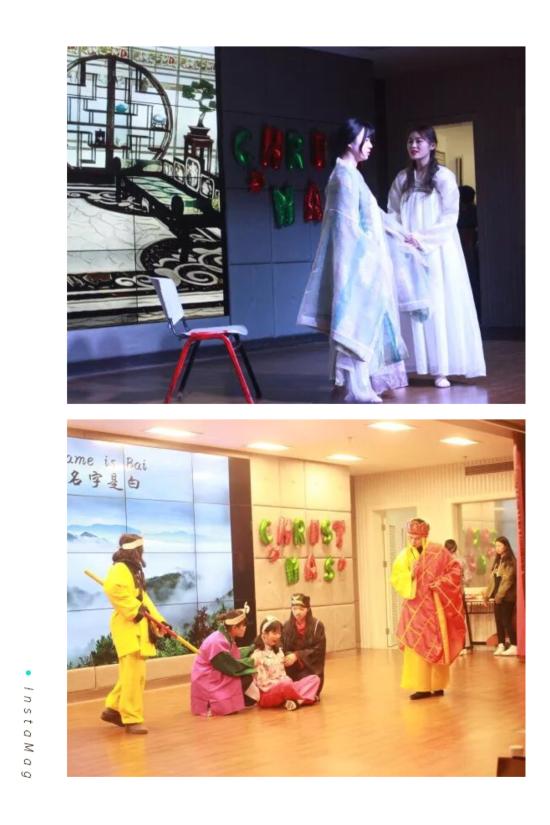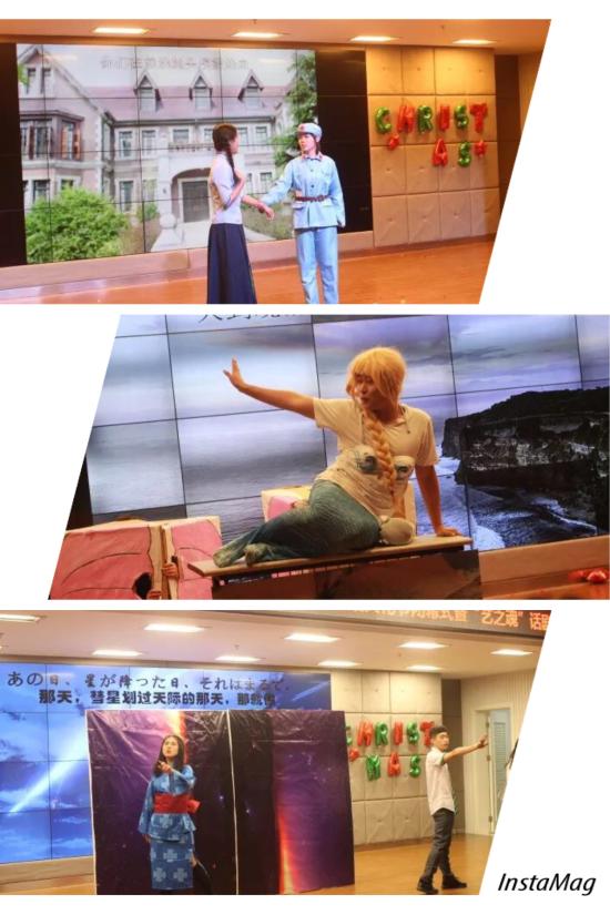 随后,话剧汇演正式开始。汉语言文学专业的爱情绝唱《长恨歌》,将唐玄宗和杨玉环的情感悲剧演绎得淋漓尽致,开头结果的昆曲演唱,更是该剧的点睛之笔。英语专业带来的改编版《西游记•三打白骨精》,英语台词配合活泼有趣的流行语,加上演员幽默风趣的表演风格,赢得了热烈掌声。日语专业学生则再现了超人气电影《你的名字》,故事情节委婉曲致,演员情绪拿捏精准,使观众在温情之余,又生发出淡淡的愁绪。汉语国际教育专业则为观众们带来抗日题材的话剧《抉择》,剧中的共产党员王大志身负革命重任,毅然决然地牺牲了爱情,选择了革命事业。最后,德语专业的改编版《美人鱼》,剧中扮演美人鱼的反串表演,让人忍俊不禁,现场气氛再一次被点燃。