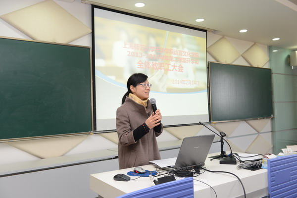 2月14日下午1点,语言文化学院在明华楼五楼演播中心召开了2013-2014学年度第二学期全校教职工大会。语言文化学院院长史文、副院长陈再阳、党总支书记孙叶青,以及语言文化学院全体教职员工出席了会议。院长史文主持会议。
