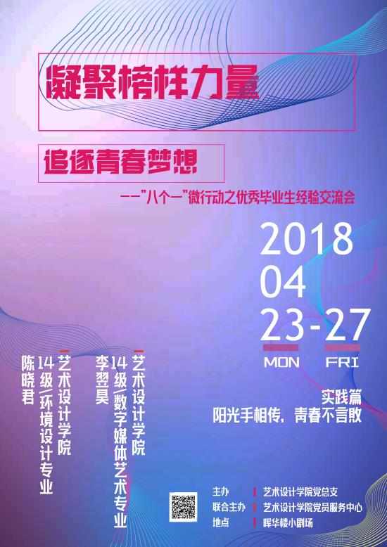 2018年4月25日下午五点,由艺术设计学院党总支组织的2018届“毕业生感恩八个一”系列活动之《凝聚榜样力量,追逐青春梦想》优秀毕业生宣讲会于晖华楼小剧场开展,本次实践篇主题为“凝志愿精神,放青春飞扬”,莅临本次宣讲会的老师有艺术设计学院党总支书记王慧荣老师,艺术设计学院党总支副书记沈思老师。