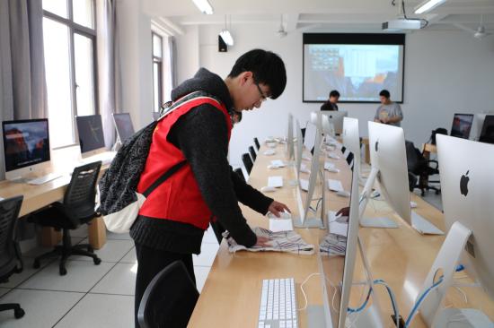 参加活动的同学们早早的就来到光华楼,穿上志愿者服,带着扫帚抹布垃圾袋等工具到达五楼机房。本次活动内容是,帮助老师整理和打扫光华楼五楼的七个机房教室。每位部员都认真听从各个老师的安排,按照要求分工明确,仔细小心地擦拭机房的电脑,键盘,一丝不苟的打扫地面。细心的同学还将机房的桌面、讲台整理干净。在活动的最后,同学在每个在机房门口张贴海报,提醒同学们保持整洁卫生。