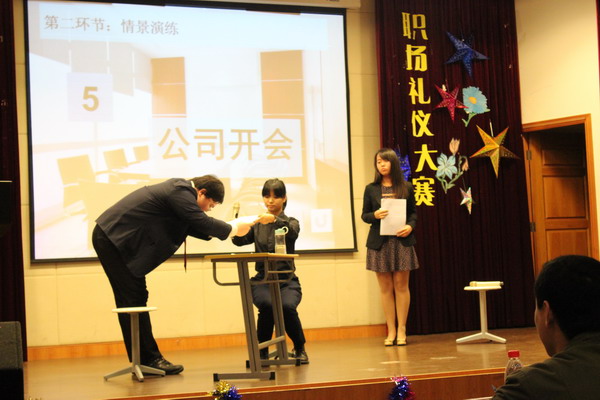 2014年4月24日下午,语言文化学院在明华楼报告厅举行第一届“乐业天空杯”职场礼仪大赛复赛。副校长、语言文化学院院长史文,语言文华学院党总支副书记周建文、蔡勇永以及各专业党支部书记参加比赛。 本次活动参赛选手共12名,分为四个小组。比赛分为两个环节,在第一轮知识竞答环节中,选手们思维敏捷,表现游刃有余。在第二轮情景演绎环节,四组分别生动演绎了公司面试、年会晚宴、机场接机、公司开会四个不同的场景。副校长史文上台致辞,他高度赞扬了本次大赛,认为大赛为学生提供了一个很好的平台,丰富了职场礼仪知识,并预祝五月中旬的职场礼仪大赛的决赛能够圆满成功。 最后经过评委打分,得分累计最高的两组选手拿到进入总决赛的通行证,同时为其他选手颁发了优胜奖状。 | | |
