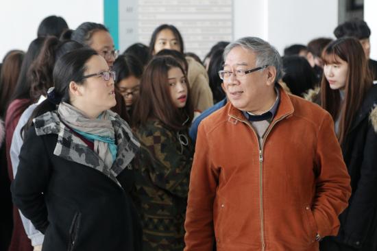 徐子卿老师主持并简要介绍了此次展览。艺术设计学院院长王大根与在场老师、学生们进行了较全面的交流,强调了作品展览对学生专业学习的重要性,并提出殷切希望。