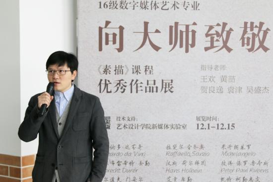 2016年12月5日下午2:00,艺术设计学院在光华楼二楼大厅开展新生作品展开幕式。本次主题是“向大师致敬”,展示16级数字媒体艺术专业新生们素描课程一学期的优秀成果。本次开幕式出席的领导老师有:艺术设计学院院长王大根老师,教育学院院长滕薇老师,校党委书记助理凌琦老师,艺术设计学院副院长徐子卿老师,党总支书记王慧荣老师,素描课程负责人黄喆老师等。