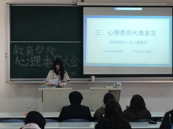 会议伊初,主持人向大家介绍了彩虹心灵工作室的发展历程、工作宗旨以及组织框架。紧接着,回顾了过去三年开展的精彩活动,并布置了教育学院心理委员新学期工作计划。接下来,15级、16级心理委员代舒慧、张晓晔两位同学就“如何成为一名优秀的心理委员”主题发表独到的见解,她们的精彩分享让同学受到了许多启发。