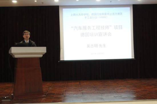 “汽车服务工程技师”项目德国培训宣讲会于 2017年12月27日14:30至16:00期间,在图书馆四楼报告厅开讲。这次主讲是吴志明先生,出席本次宣讲会其他领导老师有天华学院副校长、工学院院长吴国兴,质检处处长、工学院汽服专业带头人陈道炯,常务副院长林军,汽服专业主任石玲,机电专业主任何燕及工学院各专业老师。