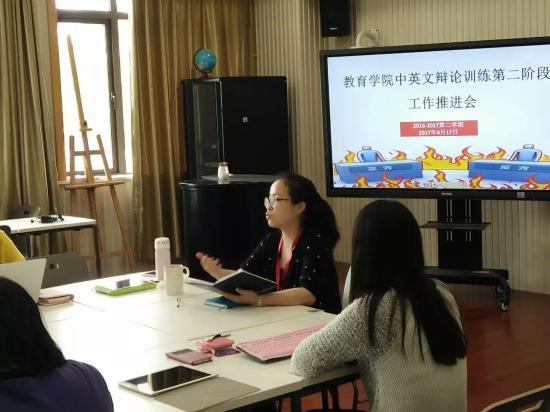会议开始,沈晓燕老师总结了教育学院第一阶段中英文辩论训练的特色工作,并汇总了第一阶段辩论训练中出现的问题,希望各位辅导员能根据第一阶段的情况,在第二阶段的辩论训练中指导同学们加以改进。随后沈老师特别强调教育学院院务会专门就中英文辩论训练的工作进行讨论,也征得教育学院专业主任的同意,逐步将辩论训练与专业技能实践学分挂钩。并以小学教育专业为试点,将制定相应的标准,对本学期小学教育专业学生的辩论训练进行评分,并给予相对应的专业实践学分。小学教育专业主任韩苏曼老师也当场表态,将全力支持学生部门开展的中英文辩论训练工作,不仅会将其纳入实践学分,也将会动员老师们加入到中英文辩论训练的指导中去。最后,辅导员们也达成共识,将各班级辩论训练的开展情况,纳入到学习型班级及学习型寝室的考核工作中去,将第二阶段的辩论工作,更加有效、完善地落实下去。
