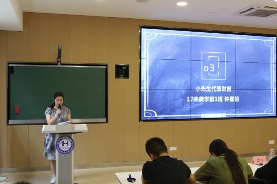 第三项议程由17级中美学前教育1班的钟嘉怡同学作为小先生代表进行发言。钟嘉怡同学分享了自己十几年以来的学琴经历,旨在号召同学们不要因为一时的挫折便轻易放弃,并告诉在场的学员们要有坚持不懈的精神才能学好钢琴。