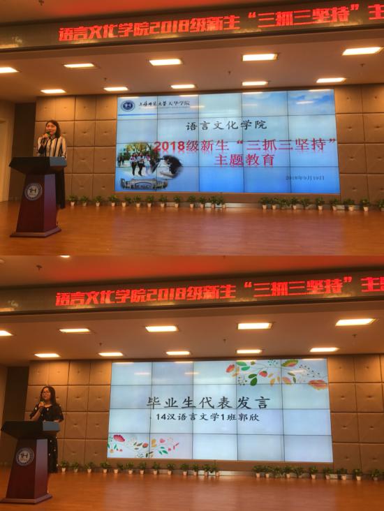 2016英语专业的齐楠同学代表在校生分享了对“三抓三坚持”育人理念的感想,并总结为6个词:“英语、阅读、思维;我们、学校、老师”。齐同学结合自己的成长经历、感悟体会,希望学弟学妹们在大学生活中能够多读,多看,多想,多说,成就属于自己的大学辉煌时光。
