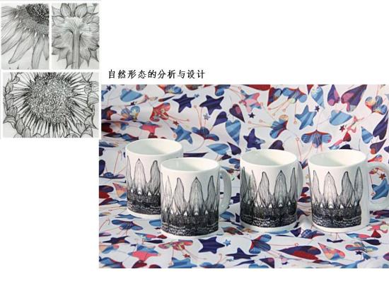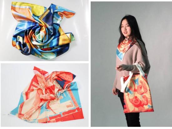 环境设计专业展示区不仅展现了学生造型能力的训练成果,李娟老师更是创新性的给低年级设置课外设计项目,让学生提前进入设计学习。以“学生作品的商业化拓展”为实验任务,每小组资助200元实验经费,大胆尝试,引导学生将课堂作品应用于不同的物品上,并形成真正的产品。现场展示印有绘画作品的雨伞、马克杯、鼠标垫、丝巾、电脑包等等充满无限巧思与创意,印证了具象与抽象是相互依存和相互转化,其学生设计作品令参观的老师们和同学们爱不释手。