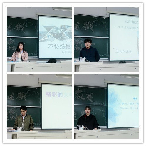 班委是一个班级的管理团队,是协助学校、辅导员开展工作的得力助手,在学生中起到了带头模范作用。一个好的班委团队可以带领班级走向成功。此次演讲的同学有17环境1班的副班长陶莹同学、学习委员焦小玲同学;17环境2班体育委员裘旭栋同学、团支书邱陈婕同学;17环境3班班长叶霞同学、生活委员何思超同学以及17环境4班班长夏毅同学、文艺委员朱琳同学。
