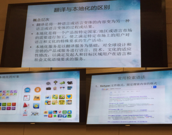 在讲座中,刘克超董事长结合自己丰富的翻译和管理经验,就翻译与本地化的区别,计算机辅助翻译概念、翻译软件和设备及翻译工作流程,机器翻译,现代语言服务人才的素质要求等方面进行了深入浅出的阐述,并推荐了不少有助于专业学习和翻译实践的计算机软件和操作方法。