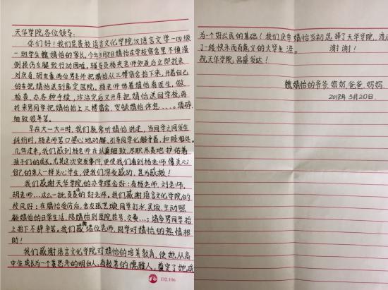 魏静怡同学家长在感谢信中还写道:“我们感谢语言文化学院对静怡的培养教育,使她从高中生成长为一个善思考的明白人,有教养的儒雅人,奠定了她成为一个好公民的基础。我们庆幸当初选择了天华学院……”。虽然只是简短的只言片语,却充分体现了家长对我校办学理念和优良校风的肯定与赞赏。