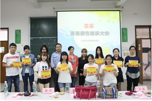2014年5月28日,由语言文化学院英语专业举办的首届英文报告展示大赛在日华楼阶梯教室举行。语言文化学院分团委书记杨央、英语专业主任邢玥以及英语专业教师袁振和史媛作为评委出席了本次大赛。?xml:namespace>