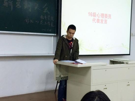 为充分发挥班级心理委员三级防预机制、高效开展二级学院心理健康教育工作的作用,教育学院于2016年11月8日下午16:30,在光华楼302教室召开了心理委员新学期大会。参加此次会议的是15、16级全体心理委员,由秦菲同学担任主持,教育学院彩虹心灵工作室指导老师周丹妮莅临参加。