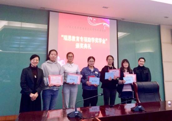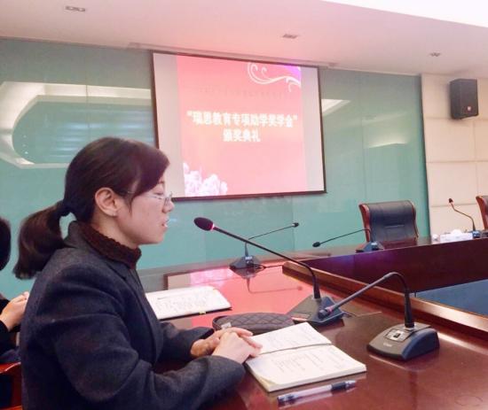 2017年11月13日下午,我校语言文化学院英语专业2017年“瑞恩教育专项助学奖学金”颁奖典礼在明华楼五楼会议中心举行。语言文化学院常务副院长陈再阳、党总支书记兼副院长孙超、英语专业主任胡玥、英语专业实习实训负责人王晓岚、上海嘉定瑞恩教育进修学校校长余露女士、副校长王娟女士、校办主任邓书梅女士,6位获奖学生及学生代表参加了本次颁奖典礼,会议由王晓岚老师主持。