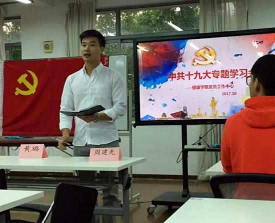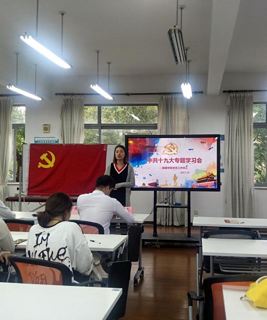 健康学院党总支为推进“两学一做”学习教育活动,进一步加强同学们思想政治教育和形势政策教育,2017年10月25日下午4:30于天华楼258教室开展十九大精神专题学习会。健康学院党总支副书记周建光、黄璐,应用心理学专业党支部副书记刘卫卫及党员工作站全体成员出席本次活动。