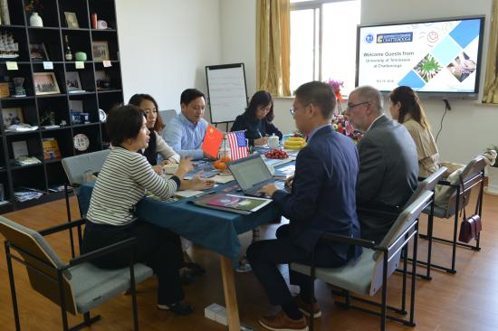 2018年10月15日,美国田纳西大学查塔努加分校(University of Tennessee Chattanooga)教务长兼商学院院长Robert Dooley与国际处主任Takeo Suzuki应邀来访我校。我校校长叶才福、国际交流处处长胡珍、管理学院院长助理盛术俊、国际商务专业主任于凤艳、财务管理专业(国际课程合作)专业主任李曦热情接待。