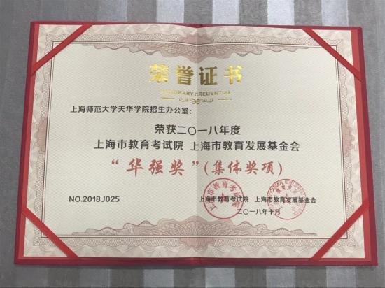 “华强奖”由上海市教育考试院、上海市教育发展基金会发起设立,旨在推进考试招生制度改革,推动各级招考机构发展,激励各级员工投身招考事业。我校招办与复旦大学、华东理工大学、华东师范大学等12所上海市高校招办获得先进集体荣誉称号。同时我校与上海市19家考点获评先进集体荣誉称号。