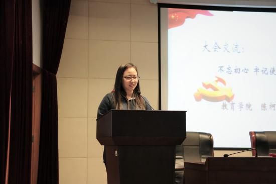 首先,由教育学院的陈柯锦同学、健康学院的杨紫琰同学分别作为入党积极分子代表上台交流学习心得。通过一个月的培训学习,学员们进一步端正了入党动机,认识到了学习、工作、生活等方面的差距和今后努力的方向。此外,大家也意识到:要坚定理想信念,不断端正入党动机;要牢记当代青年人的历史使命、努力践行社会主义核心价值观;要起到入党积极分子的先锋模范作用,为学校党建、党风、党的形象增添光彩。