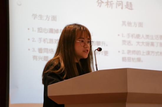 大赛的第七小组的创意主题为:课堂使用手机的现状分析及对策探究。该组同学敏锐的发现,今天大学的课堂上,使用手机已成为一种普遍现象,严重影响到课堂的教学秩序和学习效果。通过调查研究,他们发现玩手机已经成为学生下意识的“习惯”,即使心有愧疚,但很难改正。进而,他们对导致这种现象的原因进行了分析。最后,他们从学校、学生、教师三个层面给出了一套解决方案。
