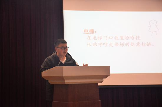 大赛的第五小组的创意主题为:电梯拥堵问题的分析与解决。该组同学深入商场、办公场所进行了大量的调查走访,发现电梯拥堵现象已经成为普遍的社会问题,就造成这一现象的原因进行了系统梳理。进而,小组给出了二组解决方案,即简单直接型和复杂创新型。在此基础上,他们对方案进行了进一步优化,给出了最佳解决方案:增加商场楼梯的趣味性,吸引顾客,减缓电梯压力;在电梯里贴创意,达到既愉悦心情,又能宣传引导的目的。