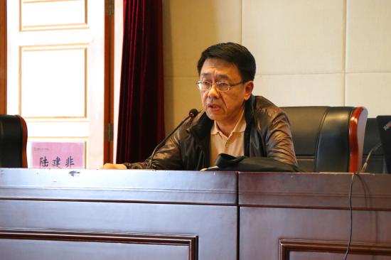 会议开始,党委书记陆建非指明本次报告会旨在开阔眼界,提升格局,让各位党员教师了解国家的最新战略,认真学习落实习近平在上海的系列讲话精神,并且简单介绍了李猛教授以及本次大会的主题。