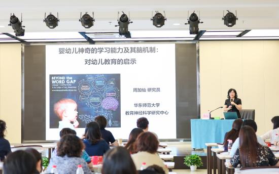 周主任介绍了教育神经科学在国内外的发展状况,从“国际心智、脑与教育协会(IMBES)”的创立、以及国内外对于教育神经科学的重视程度进行了概述,引用生动案例,分析阐述了脑与教育的关系,着重解释了“婴幼儿的语言能力”“婴幼儿的阅读能力”中婴幼儿神奇的学习能力,从大脑和神经发展的角度对我们熟悉的学习现象做了解读,解释了脑科学与有效教学的关联,提出了基于脑与认知科学开展教学策略和设计教育教学行为的科学性。周主任给大家最深刻的启发是:教育的本质是人脑皮层的改造再利用。