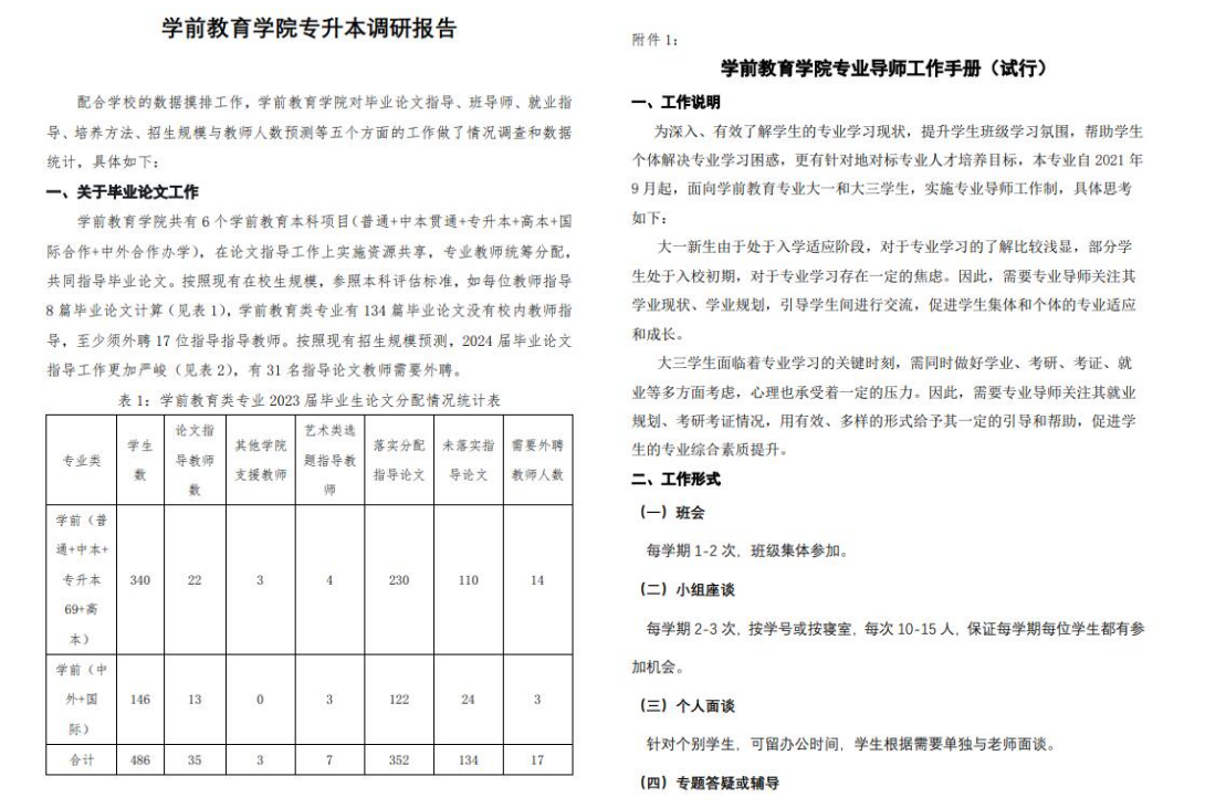 我校召开“专升本”培养质量提升专题会议为更好地提升我校“专升本”教育教学质量,把党的二十大精神落实到人才培养的各方面、全过程,办好人民满意的教育,11月25日下午,我校召开“专升本”培养质量提升专题会议,学校董事会、党政监领导、各二级学院正副院长、党总支书记和相关职能部门负责人参加了本次分析会,会议由龚春蕾副校长主持。正式会议前,各二级学院对所在学院专升本专业的教学现状以及资源需求进行了详尽的调研,包括培养方案设计、专业班导师推进、就业情况分析、任课教师及毕业论文指导教师储备等方面工作,累计提交了近2万字的书面分析报告,在11月中旬的期中教学检查中通过召开学生座谈会,了解2022级专升本新同学在学习和生活上的情况,供本次专题会议决策咨询使用。(学前教育学院专升本调研报告及班导师工作手册)会议首先由各二级学院围绕招生、培养和就业三方面进行深入分析和汇报交流。学前教育学院通过外聘行业专家和优秀幼儿园园长进课堂,做好专业教学资源储备,实践“A+B角色”授课模式;初等教育学院建立专升本教研组,在课程教学中融入专四等级考试内容,对课程学习、考级考证、毕业论文等方面开展精准指导;健康学院对现有培养方案进行重构,提升专业内涵和竞争力,促2022-11-29 -
