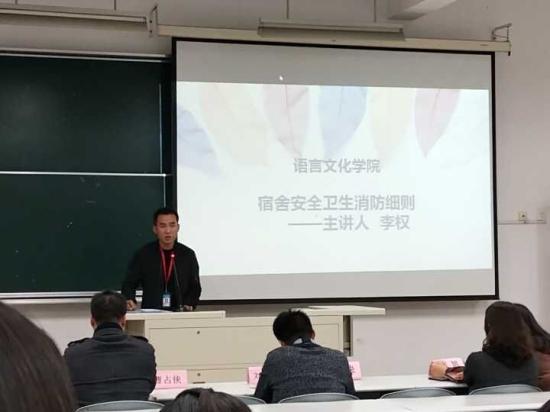 语言文化学院召开“文明守纪树良风,安全卫生我先行”宿舍安全卫生工作大会2017年11月13日晚,结合学保处本月“消防安全月”工作部署,语言文化学院党总支在日阶302教室召2017-11-17 -