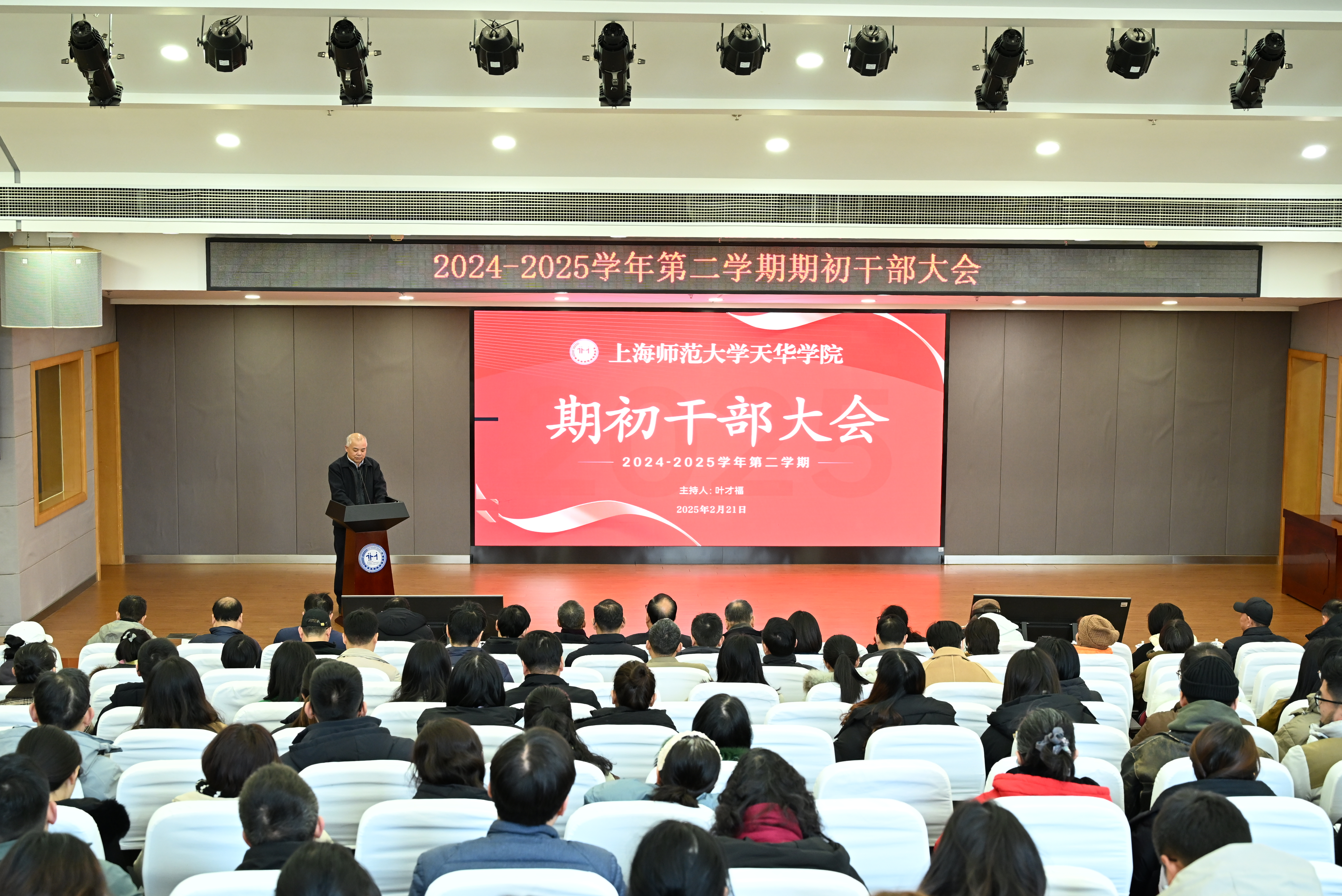 学校召开2024-2025学年第二学期期初干部大会2月21日上午,学校在晖华楼报告厅召开2024-2025学年第二学期期初干部大会。会议围绕2025年上海市教育大会精神、2025年春季上海高校党政负责干部会议精神以及学校董事长邹荣祥最新讲话要求,明确了新的一年工作目标和思路,部署了各项准备工作,确保新学期的良好开局。学校主要领导、校务委员会会成员;二级学院正副院长、党总支正副书记;职能部门正副处长;支部书记;专业主任、教研室主任;助理;各二级学院院办主任出席会议。会议由总校监叶才福主持。2025年是“十四五”规划收官、“十五五”规划布局之年,也是学校建校20周年续写华章继往开来的重要之年。新的学期,学校党政监认真对标上位要求,深入思考董事长期末总结大会和期初校务委员会的讲话要义,遵照董事会制定的未来发展战略方针,谋划部署各项要事实事。党委书记高建华表示,学校党委将继续坚持党建引领、发展联动、服务协同,“干”字当头,“实”字为要,增强党建引领实效,紧扣学校中心工作,利用“民创”项目资源,把党建功能转化为发展动能;增强人事工作实效,以提升师资队伍整体素质、优化人事管理服务为核心,推动学校人事人才工作高质量发展;增强学风建设实效,坚持具有学2025-02-21