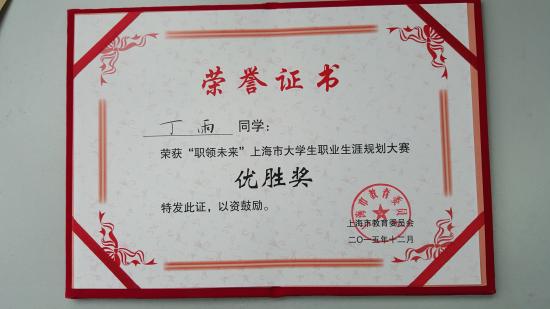 丁雨同学荣获上海市职业生涯规划大赛优胜奖为贯彻落实教育部《关于做好2015年全国普通高等学校毕业生就业创业工作的通知》(教学﹝2014﹞152016-01-11 -