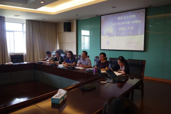 语言文化学院召开新学期全体教职工大会2015年9月2日下午,语言文化学院在明华楼会议中心召开了2015-2016学年第一学期2015-09-07