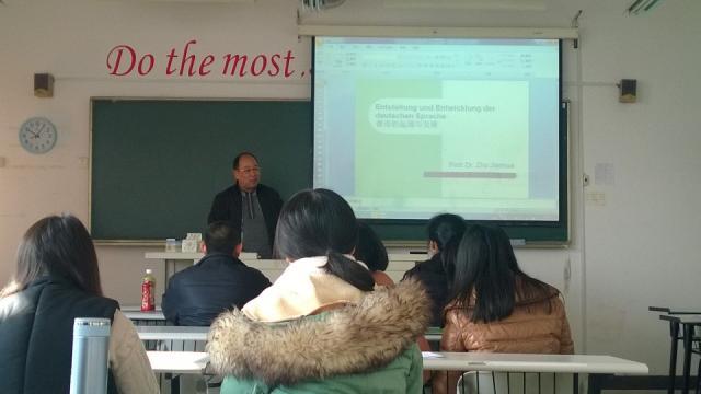 语言文化学院德语专业指导教授来校讲座2014年12月18日, 语言文化学院德语专业指导教授朱建华为2014级德语专业学生做了题为《德语的2014-12-29 -